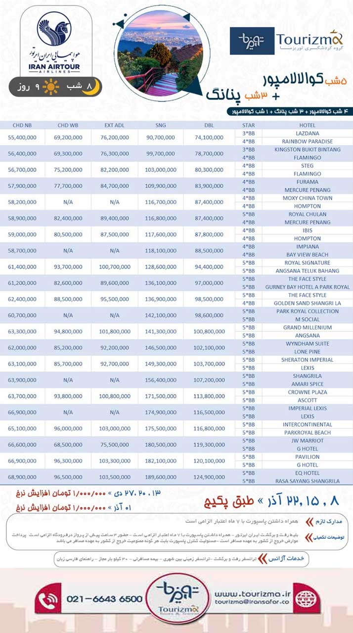 لیست قیمت تور کوالالامپور پنانگ